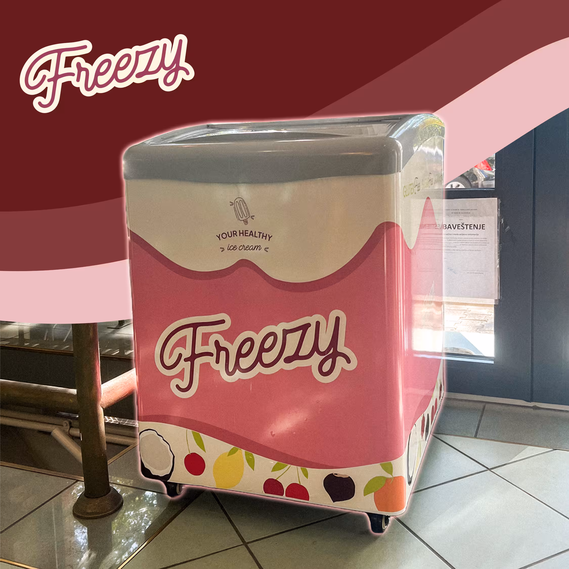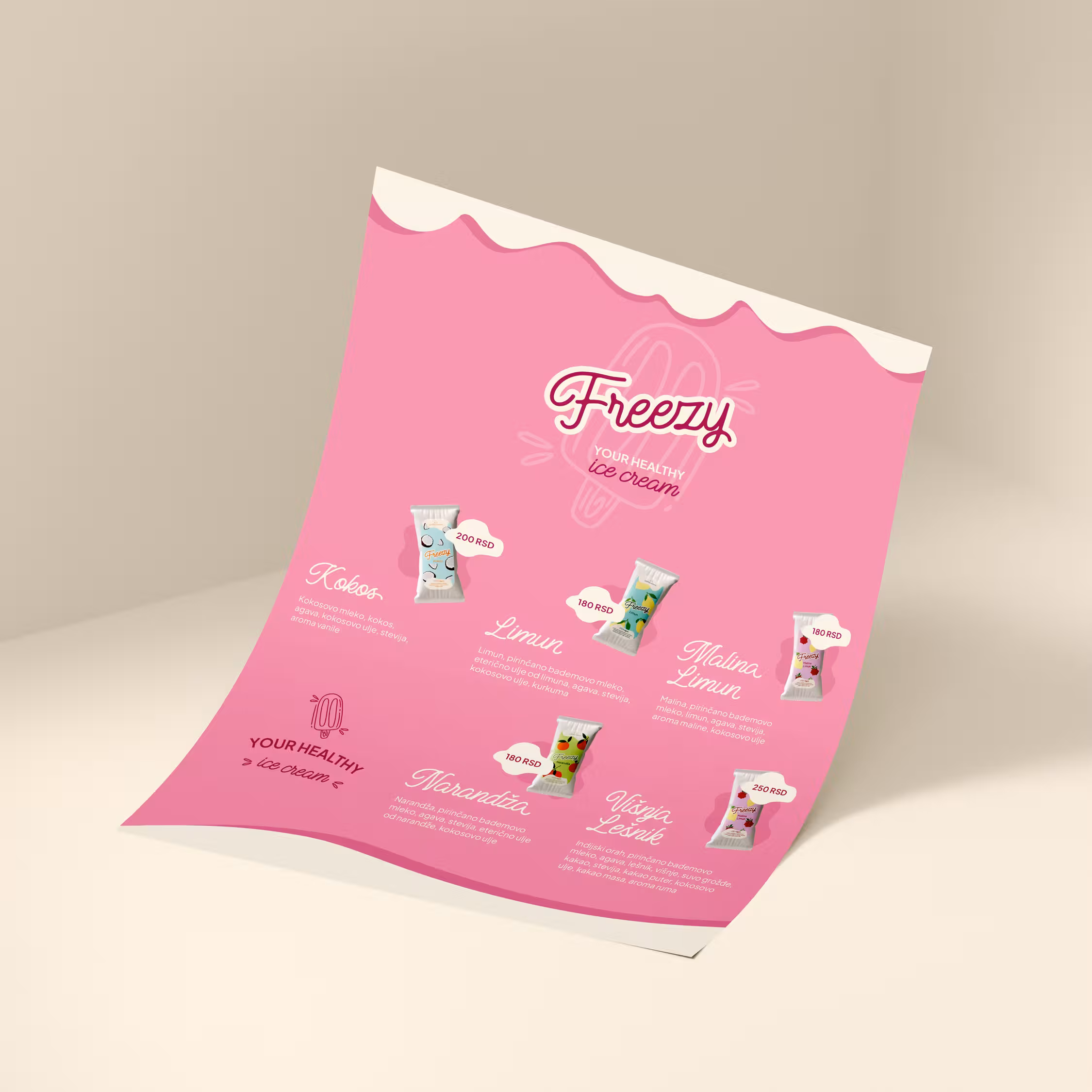 With the arrival of summer came ice cream season — and the opportunity to expand Šećernema’s visual story into print. The project included branded ice cream labels, custom-designed ice cream crates, and a clean, easy-to-read ice cream price list.